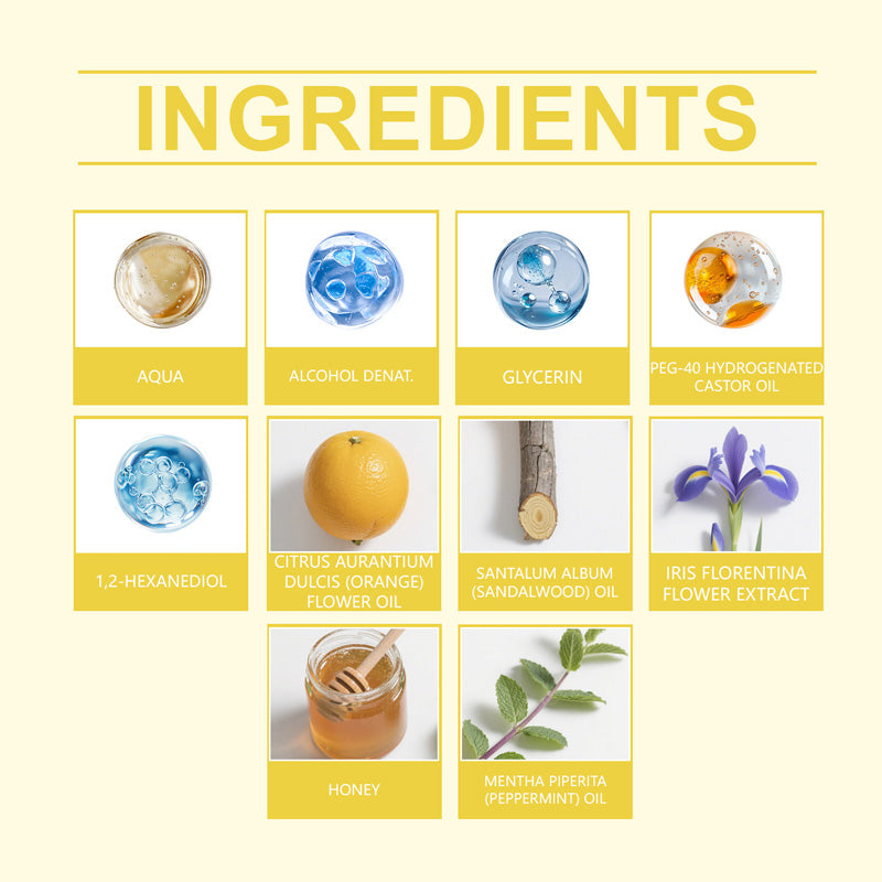Ingredients:Aqua, Alcohol Denat, Glycerin, Peg-40 Hydrogenated, 1.2-Hexanediol, Honey and etc..