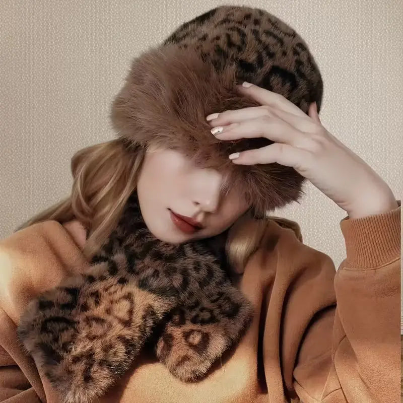 Package Includes:1*Leopard-Print Plush Hat & Scarf 2-Piece Set